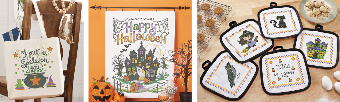 Give your home library a witchy makeover with these spell book accessories in the Spellbound Set Plastic Canvas. The coasters will keep your table protected from your glasses of witches’ brew, and the coordinating tissue box cover will vanish that boring tissue box. The Trick or Treat Baskets Plastic Canvas Kit makes the perfect pair to hold all your Halloween goodies. The Frightful Friends Wall Hanging Plastic Canvas Kit is more cute than scary. These playful Halloween friends are ready to greet trick-or-treaters!